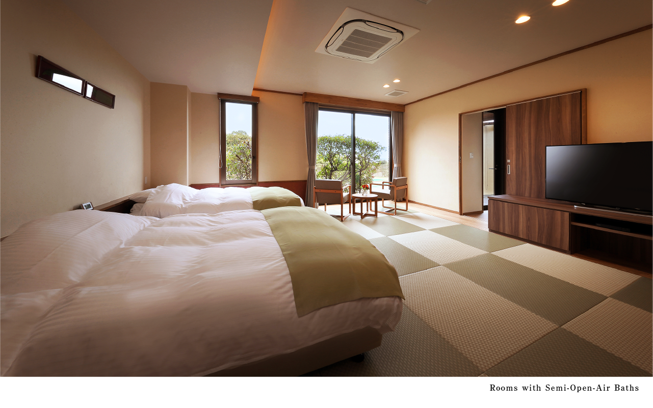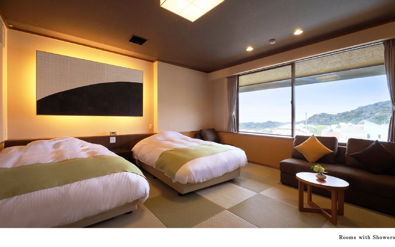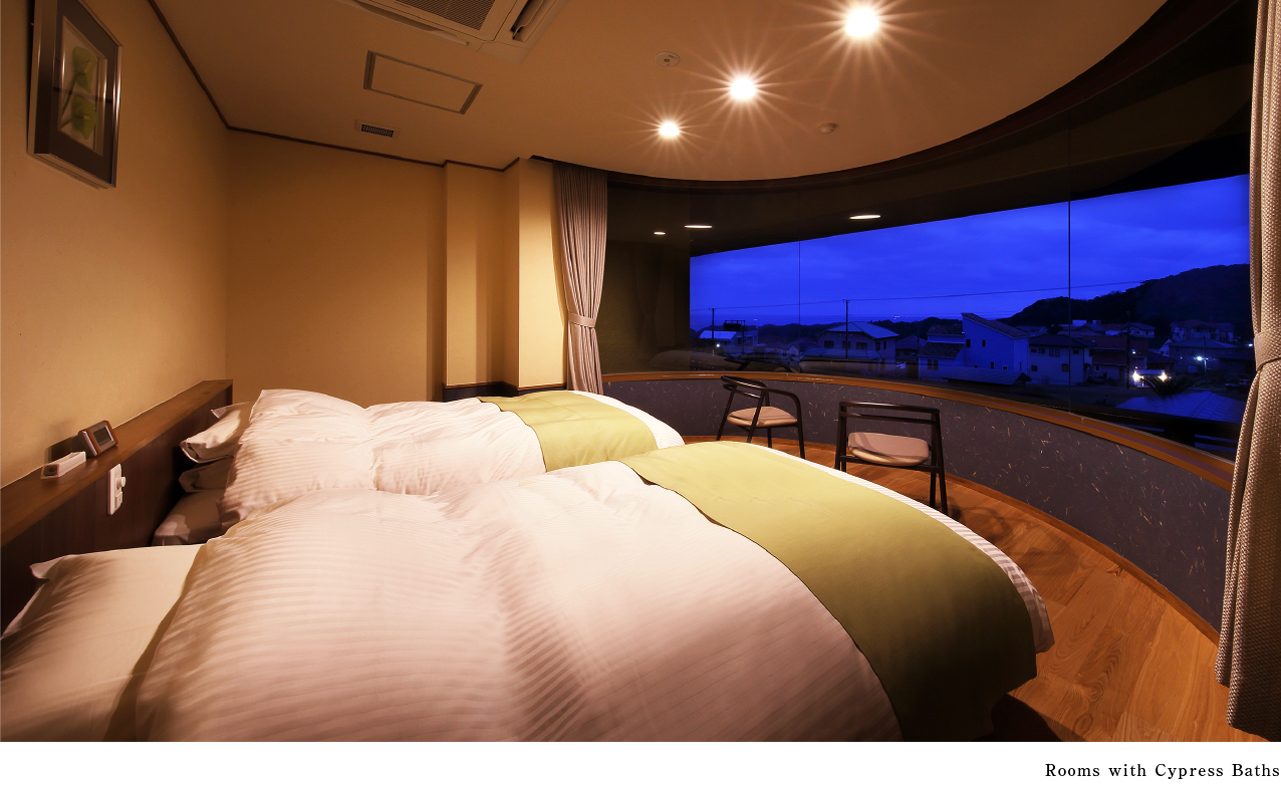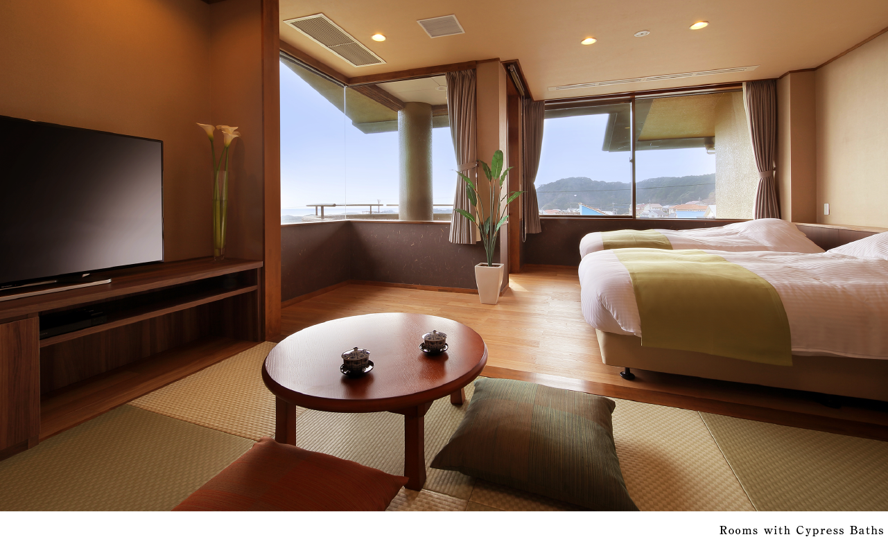 Room Types: Special Rooms with Open-Air Baths, Rooms with Semi-Open-Air Baths, Rooms with Cypress Baths, Rooms with Showers. Please choose the room type that suits your preference. All rooms are Japanese-Western style with twin beds. We offer 8 different room types with various themes. (The beds are spacious double size, except for some rooms). On the 1st floor, there is a spacious terrace, and on the 2nd floor, there are 8 types of rooms, including corner rooms that offer views of Katsuura's streets and the horizon. Each room is equipped with a coffee machine and a water server, so you can enjoy drinks at your convenience."